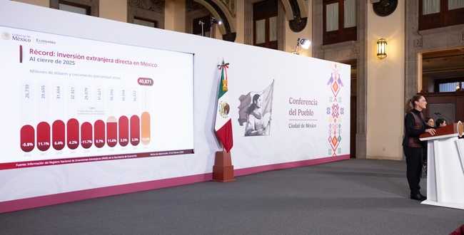 La Presidenta Claudia Sheinbaum Pardo resaltó que México alcanzó una cifra histórica de Inversión Extranjera Directa (IED) en 2025 al recibir 40 mil 871 millones de dólares, lo que representa un crecimiento de 10.8 por ciento respecto a 2024, la cifra más alta registrada en un ejercicio anual, lo que refleja que México va bien, la confianza en el país y que el modelo económico de la Cuarta Transformación da resultados.