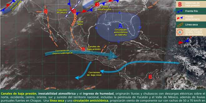 Canales de baja presión extendidos sobre distintas regiones de la República Mexicana,