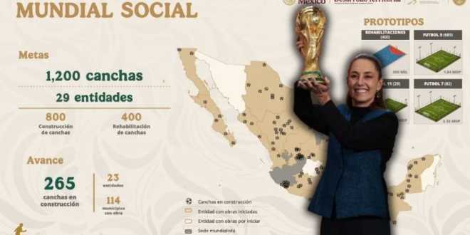 En el marco de la celebración de la Copa Mundial 2026, la Secretaría de Desarrollo Agrario, Territorial y Urbano anunció la construcción de mil 200 canchas de fútbol en 29 estados de la República.
