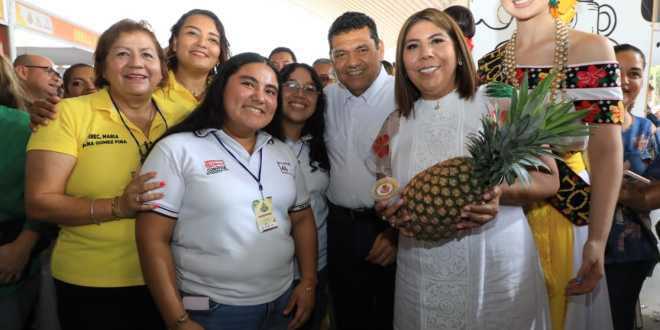 En el pabellón de Rey Limón y Reina Piña, don Jesús López Rivera le regaló unas cajas de los productos que se cosechan en el campo huimanguillense y se exportan a los supermercados de Estados Unidos, además de unas gorras amarillas.