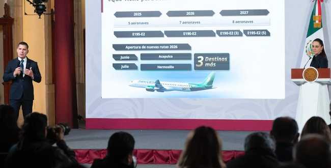 Anunció que en mayo, la aerolínea del Estado mexicano recibirá la primera aeronave Embraer de las siete programadas para este año, con lo que concluirá el 2026 con una flota de 12 aviones. Para 2027 llegarán ocho más, sumando 20 en total. Agregó que en junio de este año se abrirá la ruta hacia Acapulco, Guerrero y en julio a Hermosillo, Sonora; además se estima abrir tres destinos más.