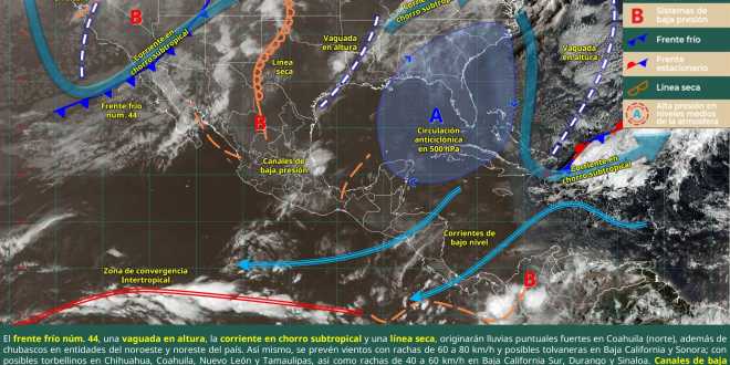 44, que se extenderá sobre el noroeste de México, una vaguada en altura, canales de