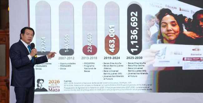 En materia de apoyos, indicó que mientras en el sexenio de Fox se otorgaron 28 millones de becas, con Calderón 37 millones y con Peña 44 millones, en el gobierno de López Obrador se alcanzaron 58 millones y, para el periodo 2024-2030 se prevé llegar a 129.5 millones de apoyos, lo que representa 4.6 veces más que con Fox; 3.4 veces más que con Calderón, y 2.8 veces más que con Peña, además de significar 100 millones de becas adicionales respecto al periodo 2000-2006.