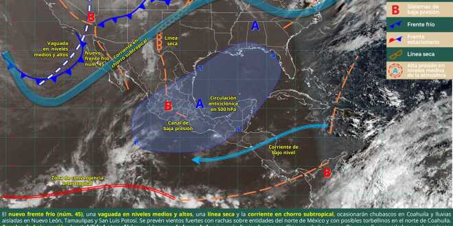 Por otra parte, el ingreso del frente frío número 45 por el noroeste de México y una línea