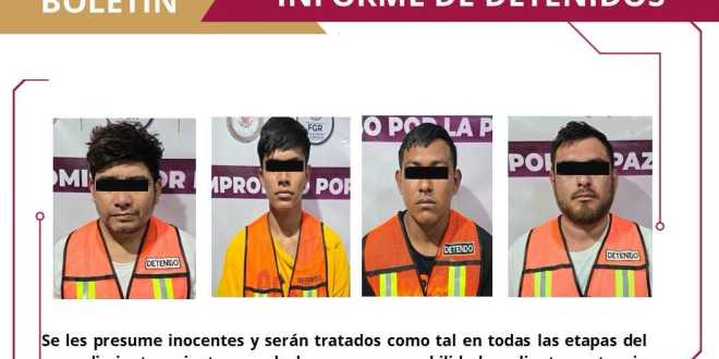 En acciones preventivas en la calle Guadalupe Lázaro de la Villa Chichicapa, Comalcalco, fueron detenidos: Manuel Estanislao «N» (a) “El Nelo”, de 33 años de edad; Juan Josué «N» (a) «El Bocho», de 23 años; Fernando Wuanerge «N» (a) «El Flaco» de 18 años; e Isidro «N» (a) «El Chilito» de 35 años de edad.