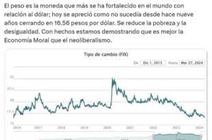 El presidente Andrés Manuel López Obrador afirmó que el peso mexicano ha experimentado el mayor fortalecimiento frente al dólar en comparación con otras monedas en todo el mundo, luego de terminar el miércoles con un valor de 16.56 pesos por cada dólar estadounidense. “Hoy se apreció como no sucedía desde …