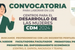 El Instituto Estatal de las Mujeres de Tabasco en el marco del Programa para el Adelanto, Bienestar e Igualdad de las Mujeres (PROABIM) en coordinación con el Instituto Nacional de las Mujeres (INMUJERES), convocan para participar en la Convocatoria para laborar en los Centros para el Desarrollo de las Mujeres …