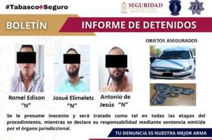 En hechos distintos y como presuntos responsables, elementos de la policía estatal detuvieron en la colonia Casa Blanca a María del Carmen “N” por robo a comercio. En la colonia Mayito se detuvo a Romel Edison “N”, Josué Elimeletc “N” y Antonio de Jesús “N” por robo de vehiculo equiparado …