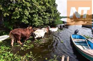Centla, Tab. Para muchas familias y productores del estado la contingencia no ha terminado. Zonas del estado continúan anegadas, como es el caso de este grupo de campesinos que se arriesgan a cruzar el río Grijalva para llevar su ganado hacia los pastizales, pues la falta de pastura ha provocado …