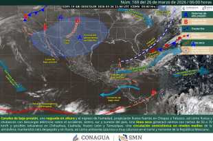 Para este jueves, se pronostican lluvias puntuales fuertes (de 25 a 50 milímetros [mm]) en regiones de Chiapas y Tabasco; intervalos de chubascos (de 5 a 25 mm) en zonas de Jalisco, Michoacán, Guerrero, Puebla, Veracruz, Oaxaca, Campeche y Quintana Roo, además de lluvias aisladas (de 0.1 a 5 mm) …