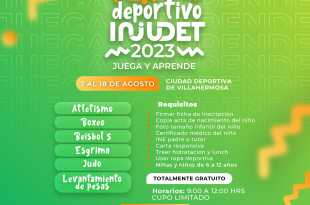 Con el objetivo promover la sana convivencia y aprovechamiento del tiempo libre en las vacaciones de verano de la niñez tabasqueña, el Instituto de la Juventud y el Deporte de Tabasco invita a padres y madres de familia a inscribir a sus hijos en “Juega y Aprende” Verano Deportivo INJUDET …