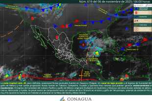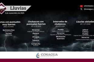 Para este jueves se pronostican lluvias puntuales fuertes (de 25 a 50 milímetros [mm]) en regiones de Oaxaca (suroeste), Tabasco (norte, centro y oeste), Chiapas (norte, este y sur), Campeche (oeste), Yucatán (norte y este) y Quintana Roo (norte y costa); intervalos de chubascos (de 5 a 25 mm) en …