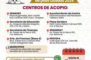 Con la meta de recaudar 15 toneladas de baterías, este lunes inicia el Reciclatón de Pilas Usadas 2025, que contará con 25 centros de acopio ubicados en diversos puntos de Villahermosa y de los 17 municipios del estado, con el propósito de darle una disposición final adecuada a estos desechos …