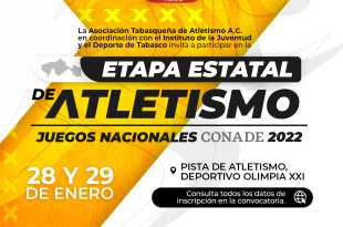 Con miras a los Juegos Nacionales CONADE 2022, la Asociación Tabasqueña de Atletismo AC y el Instituto de la Juventud y el Deporte de Tabasco (Injudet), emitieron este martes la convocatoria para el selectivo estatal en la disciplina de atletismo. Serán los próximos días 28 y 29 de enero, cuando …