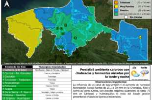 La influencia de un canal de baja presión y el aumento de humedad favorecerán potencial de lluvias fuertes de 25.1 a 50 mm en subregiones de Chontalpa, Ríos y Sierra así como Centla, mientras que podrían presentarse registros superiores de hasta 75 mm en Cárdenas y Huimanguillo. El resto del …