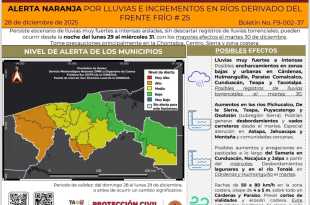 La Coordinación Nacional de Protección Civil informa que el frente frío número 25 dejará precipitaciones muy fuertes, así como evento ‘norte’ en las cosas de Tamaulipas y Veracruz. Piden a la ciudadanía extremar precauciones. Redacción Villahermosa La Coordinación Nacional de Protección Civil (CNPC), de la Secretaría de Seguridad y Protección …