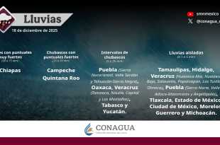 Se pronostican para hoy lluvias muy fuertes (de 50 a 75 milímetros [mm]) en Chiapas; fuertes (de 25 a 50 km/h) para Campeche y Quintana Roo; chubascos (de 5 a 25 mm) en Oaxaca, Tabasco, Yucatán, Sierra Nororiental, Valle Serdán y Tehuacán-Sierra Negra, regiones de Puebla y Totonaca, Nautla, Capital …