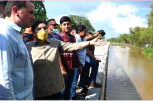 Funcionarios federales, estatales y municipales, encabezados por el secretario de Gobierno, Guillermo del Rivero, revisan muro de contención que, en época de creciente, protege a Villahermosa del río; constatan que estructura se encuentra sin daño alguno. Autoridades del Consejo Estatal de Protección Civil, encabezadas por el secretario de Gobierno, Guillermo …