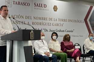 Con un reconocimiento al personal de salud del Hospital Regional de Alta Especialidad Juan Graham Casasús por su labor en la primera línea de batalla contra el COVID, el Gobierno de Tabasco oficializó que a partir de este viernes, la Torre Oncológica del nosocomio llevará el nombre del reconocido galeno …