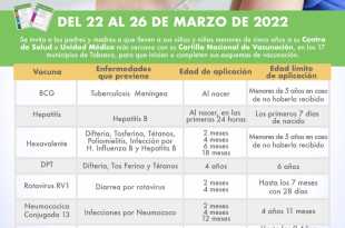 La secretaría de Salud Tabasco arranca este martes con la Primera Semana Estatal de Vacunación que se realizará del 22 al 26 de marzo, por lo que hace un atento llamado a todos los padres y madres de familia, para que lleven a sus hijos a iniciar o completar sus …