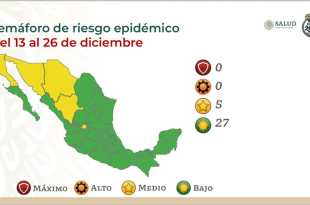 Del 13 al 26 de diciembre, 27 entidades federativas estarán en color verde, cinco permanecerán en amarillo y ningún estado se coloca en naranja ni rojo del Semáforo de Riesgo Epidémico, conforme a la evaluación del Lineamiento para la Estimación de Riesgos del Semáforo por Regiones COVID-19. En este periodo …