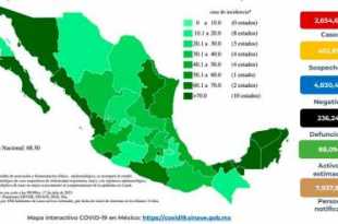 En México hasta el día de hoy se han confirmado 2, 659,137 casos totales y 236,331 defunciones totales por COVID-19. La Ciudad de México, el Estado de México, Sinaloa, Jalisco, Nuevo León, Veracruz y Quintana Roo son las entidades con mayor número de casos activos (>3,000 casos), seguida de Tabasco, …