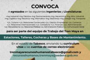 Para laborar en el Tren Maya –una de las obras prioritarias del presidente Andrés Manuel López Obrador–, la Secretaría de Educación (Setab) invita a egresados de distintas licenciaturas e ingenierías del estado de Tabasco, a formar parte de la magna obra y colaborar en estaciones, talleres, cocheras y bases de …
