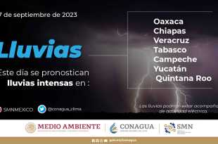 Este viernes se pronostican lluvias puntuales muy fuertes (de 50 a 75 milímetros [mm]) para regiones de Campeche, Chiapas, Nayarit, Oaxaca, Sinaloa y Veracruz; fuertes (de 25 a 50 mm) para zonas de Durango, Guerrero, Jalisco, Puebla, Quintana Roo, Tabasco, Yucatán y Zacatecas; intervalos de chubascos (de 5 a 25 …