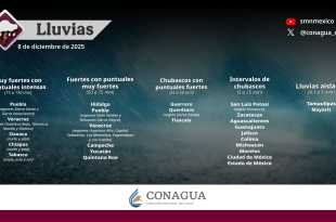 En las próximas horas, se esperan lluvias puntuales intensas (de 75 a 150 milímetros [mm]) en Chiapas (norte y este) y Tabasco (sur y sureste); muy fuertes (de 50 a 75 mm) en Veracruz (región Olmeca) y Oaxaca (este); fuertes (de 25 a 50 mm) en Veracruz (región Los Tuxtlas), …