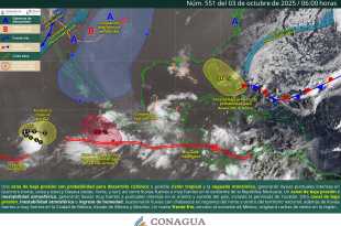Para hoy, se pronostican lluvias puntuales intensas (de 75 a 150 milímetros [mm]) en regiones de Guerrero (este), Oaxaca (norte, oeste y este), Chiapas (norte, sur y este), Tabasco (sur y este) y Veracruz (sur); muy fuertes (de 50 a 75 mm) en zonas de Nayarit, Colima, Michoacán, Campeche, Yucatán …