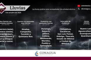 En las próximas horas, se pronostican lluvias puntuales intensas (de 75 a 150 milímetros [mm]) en Guerrero (este), Oaxaca (oeste), Veracruz (sur), Tabasco (oeste y sur) y Chiapas (norte y costa); muy fuertes (de 50 a 75 mm) en Sinaloa, Campeche, Yucatán y Quintana Roo; fuertes (de 25 a 50 …