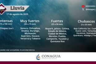 En las próximas horas, se pronostican lluvias puntuales intensas (de 75 a 150 milímetros [mm]) en Chiapas (sur); muy fuertes (de 50 a 75 mm) en Sonora, Chihuahua, Sinaloa, Durango, Michoacán, Guerrero, Oaxaca, Veracruz y Tabasco; fuertes (de 25 a 50 mm) en Nayarit, Jalisco, Colima, Estado de México, Ciudad …