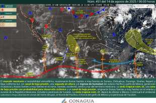 Hoy, la interacción del monzón mexicano, la entrada de aire húmedo de ambos litorales, un canal de baja presión, la onda tropical número 22 y una zona de baja presión con potencial ciclónico sobre el oeste del golfo de México, generarán lluvias muy fuertes (de 50 a 75 milímetros [mm]) …