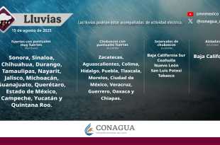 Durante este día, se esperan lluvias muy fuertes (de 50 a 75 milímetros [mm]) en Sonora, Chihuahua, Durango, Sinaloa, Nayarit, Jalisco, Colima, Michoacán, Guerrero, Oaxaca, Estado de México, Ciudad de México, Morelos, Tlaxcala, Puebla, Veracruz, Chiapas y Tabasco; fuertes (de 25 a 50 mm) en Baja California Sur, Zacatecas, Guanajuato, …