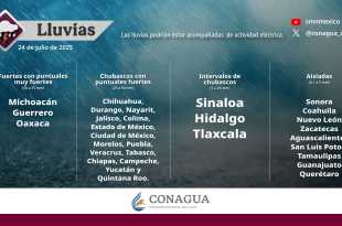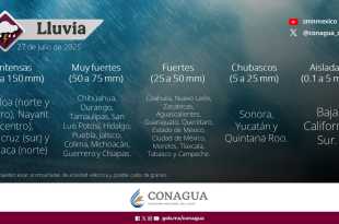 Para este jueves, se pronostican lluvias puntuales muy fuertes (de 50 a 75 milímetros [mm]) en Michoacán, Guerrero y Oaxaca; fuertes (de 25 a 50 mm) en Chihuahua, Durango, Nayarit, Jalisco, Colima, Estado de México, Ciudad de México, Morelos, Puebla, Veracruz, Tabasco, Chiapas, Campeche, Yucatán y Quintana Roo; chubascos (de …