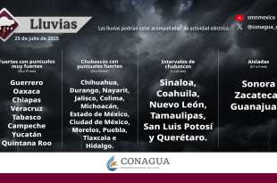 Para este domingo, se pronostican lluvias puntuales intensas (de 75 a 150 milímetros [mm]) en Sinaloa (norte y centro), Nayarit (centro), Veracruz (sur) y Oaxaca (norte); muy fuertes (de 50 a 75 mm) en Chihuahua, Durango, Tamaulipas, San Luis Potosí, Hidalgo, Puebla, Jalisco, Colima, Michoacán, Guerrero y Chiapas; fuertes (de …