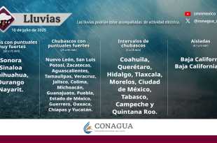 Para este jueves se pronostican lluvias puntuales muy fuertes (de 50 a 75 milímetros [mm]) en regiones de Sonora, Sinaloa, Chihuahua, Durango y Nayarit, y fuertes (de 25 a 50 mm) en zonas de Nuevo León, San Luis Potosí, Zacatecas, Aguascalientes, Tamaulipas, Veracruz, Jalisco, Colima, Michoacán, Guanajuato, Puebla, Estado de …