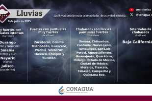 Para este miércoles, se pronostican lluvias puntuales intensas (de 75 a 150 milímetros [mm]) en Durango (oeste y suroeste), Sinaloa (centro y sur), Nayarit (norte) y Jalisco (occidente); muy fuertes (de 50 a 75 mm) en Zacatecas, Colima, Michoacán, Guerrero, Puebla, Veracruz, Oaxaca, Chiapas y Yucatán; fuertes (de 25 a …