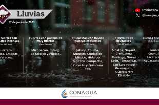 Para este martes, se pronostican lluvias puntuales intensas (de 75 a 150 milímetros [mm]) en Guerrero, Oaxaca, Chiapas y Veracruz; muy fuertes (de 50 a 75 mm) en Michoacán, Estado de México y Puebla; fuertes (de 25 a 50 mm) en Jalisco, Colima, Morelos, Ciudad de México, Hidalgo, Tabasco, Campeche, …