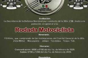 Redacción Villahermosa Con motivo de que febrero es considerado el Mes del Ejército y Fuerza Aérea Mexicanos, el próximo domingo 01 de ese mes se llevará a cabo en la ciudad de Villahermosa una Rodada Motociclista, evento deportivo y familiar organizado por la Secretaría de la Defensa Nacional. La rodada …