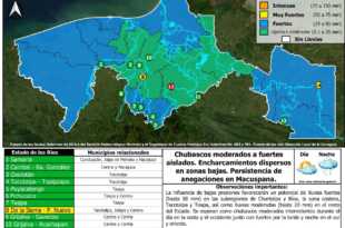 La influencia de bajas presiones favorecerán un potencial de lluvias fuertes (hasta 50 mm) en las subregiones de Chontalpa y Ríos, la zona costera, Tacotalpa y Teapa, así como lluvias moderadas (hasta 20 mm) en el resto del Estado. Se esperan como chubascos moderados intermitentes durante el día en la …