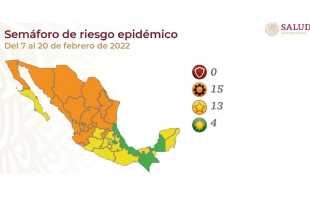 La Secretaría de Salud dio a conocer el semáforo epidemiológico que estará vigente del 7 al 20 de febrero, en el que 15 estados del país estarán en color naranja, 13 en color amarillo y cuatro en verde. La dependencia no coloreó ningún estado en color rojo en su informe …