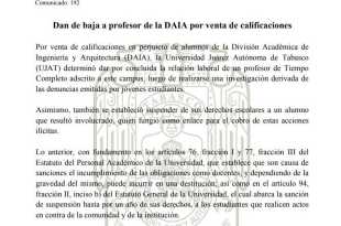 Por venta de calificaciones en perjuicio de alumnos de la División Académica de Ingeniería y Arquitectura (DAIA), la Universidad Juárez Autónoma de Tabasco (UJAT) determinó dar por concluida la relación laboral de un profesor de Tiempo Completo adscrito a este campus, luego de realizarse una investigación derivada de las denuncias …