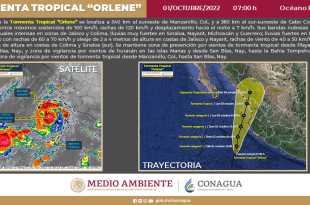 La Comisión Nacional del Agua (Conagua) alertó que este sábado, la tormenta tropical ‘Orlene’ podría evolucionar a huracán categoría 1. ‘Orlene’ ocasionará lluvias intensas en regiones de los estados de Colima y Jalisco, muy fuertes en zonas de Guerrero, Michoacán, Nayarit y Sinaloa, y fuertes en localidades de Durango. Por …