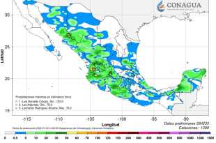 El pronóstico meteorológico para hoy es de lluvias muy fuertes (de 50 a 75 milímetros [mm]) en Durango, Jalisco, Michoacán, Nayarit, Oaxaca, Sinaloa, Sonora y Veracruz; fuertes (de 25 a 50 mm) en Chiapas, Chihuahua, Colima, Estado de México, Guerrero, Quintana Roo, Tabasco, Yucatán y Zacatecas; chubascos (de 5 a …