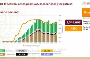 Al 30 de octubre de 2020 hay 918,811 casos confirmados #COVID19. Se han registrado 1,110,937 negativos, 91,289 defunciones confirmadas y 673,457 personas recuperadas. A nivel nacional, el 33% de camas de hospitalización general y el 27% de camas con ventiladores están ocupadas.