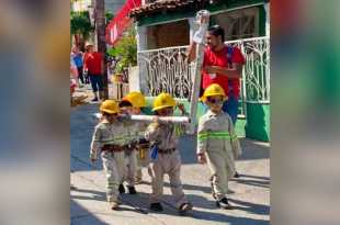 Pequeños alumnos del jardín de niños Gabriela Mistral, en el poblado de El Ocotito, municipio de Chilpancingo, desfilaron vestidos como trabajadores de la Comisión Federal de Electricidad (CFE), en el desfile conmemorativo por el 113 aniversario de la Revolución Mexicana. Habitantes de la comunidad confirmaron que el grupo de pequeños …