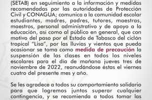 La Secretaría de Educación del Estado de Tabasco (SETAB) anunció la noche de ayer miércoles, la suspensión de clases para hoy jueves 3 de noviembre, esto como medida precautoria por el paso de «Lisa»; dicha medida aplica para todos los niveles educativos en la entidad. La dependencia también señaló que …