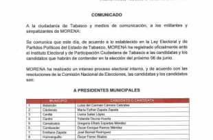 En redes sociales se dieron a conocer dos listados que se mencionan como registros oficiales del partido Morena ante el Instituto Electoral y de Participación Ciudadana de Tabasco IEPCT, de sus candidatos a presidentes de los 17 municipios de Tabasco y el segundo con los candidatos a diputados locales de …