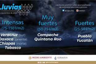 Hoy sábado, se pronostican lluvias puntuales intensas (de 75 a 150 milímetros [mm]) en el norte de Chiapas y Tabasco; muy fuertes (de 50 a 75 mm) en el sur de Veracruz, y puntuales fuertes (de 25 a 50 mm) en Guerrero y Oaxaca, generadas por el desplazamiento de la …